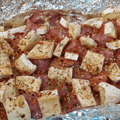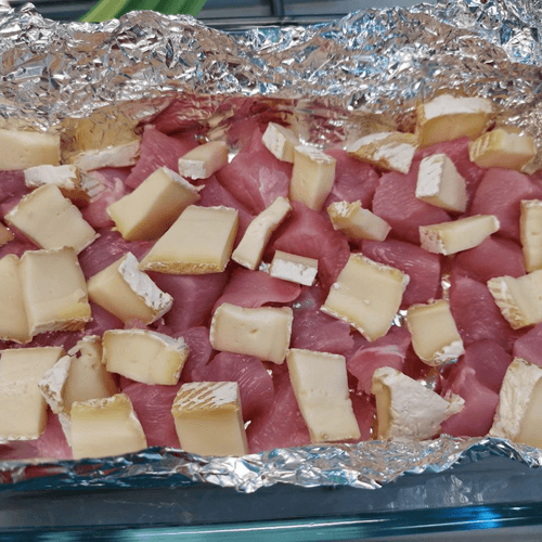 Индейку нарезать кубиками, бри квадратиками и выложить в смазанную сливочным маслом форму с фольгой.
