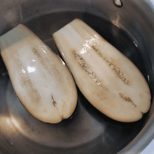 Баклажан разрезать пополам, залить кипятком, посолить и подержать его в воде около 10 минут.