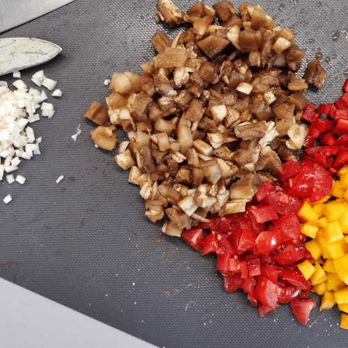 Баклажан, помидоры, тыкву, рамиро и чеснок мелко нарезать.