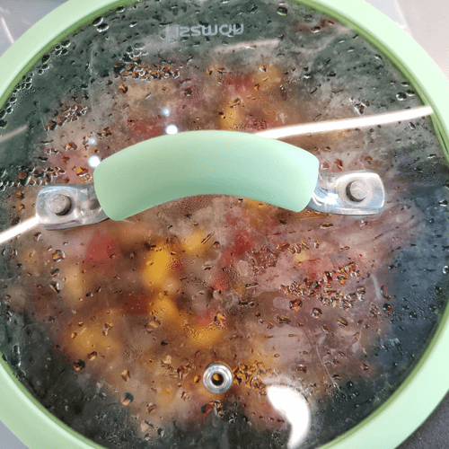 Через еще 2–3 минуты перемешать, убавить огонь и накрыть крышкой. Тушить около 7 минут.