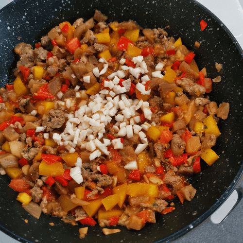 Через 3–4 минуты перемешать, добавить овощи и снова перемешать. Посолить.