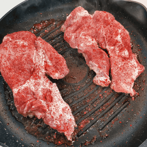 Выложить стейки на разогретую сковороду гриль, смазанную маслом. Приправить перцем чили.