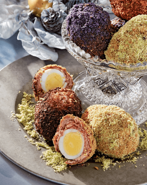 Каждое яйцо обвалять в крахмале из тапиоки, затем в яйце, затем в панировке желаемого цвета.