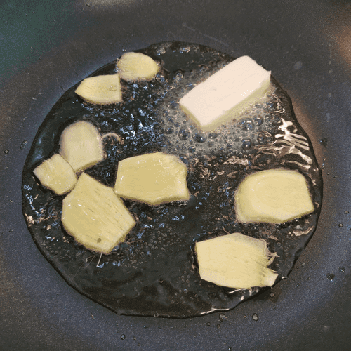 Растопить на сковороде кусочек сливочного масла, добавить столовую ложку оливкового рафинированного масла и пару щепоток крупной соли. Выложить имбирь.