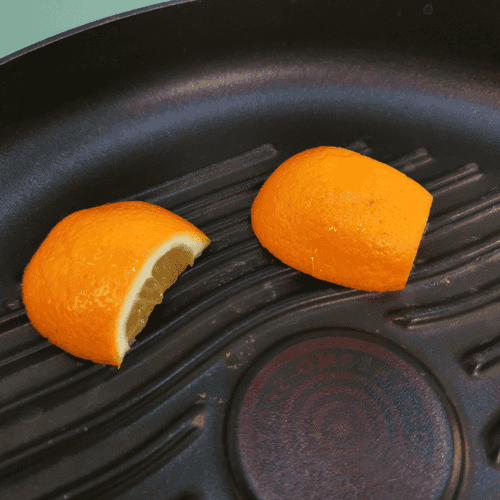 Выложить на сухую раскаленную сковороду-гриль пару долек лимона. Обжаривать на сильном огне до характерного подрумянивания.
