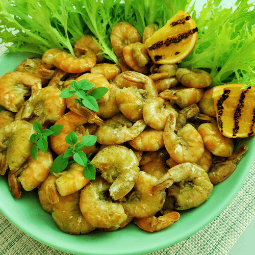 Подавать с листьями салата, сбрызнув креветки лимонным соком.