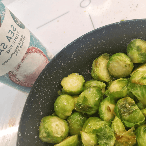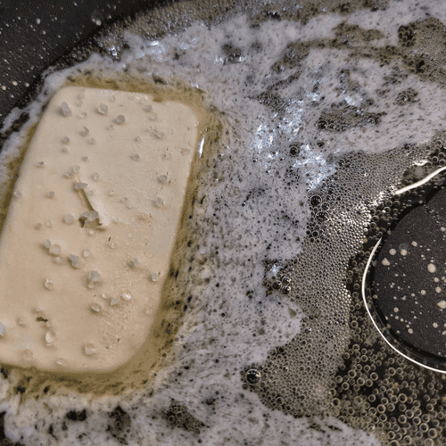 На раскаленной сковороде растопить сливочное масло и добавить пару щепоток крупной соли.