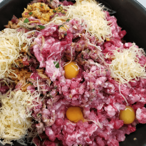 Добавить к фаршу сыр и яйца.