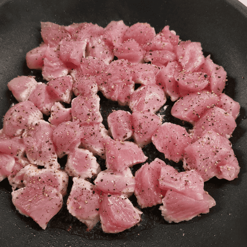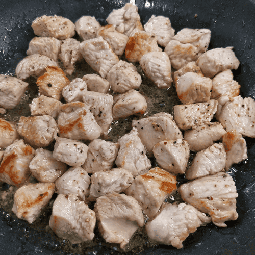Приправить смесью перцев. Обжаривать на сильном огне.