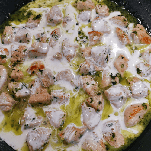 Через 2–3 минуты влить сливки и перемешать.