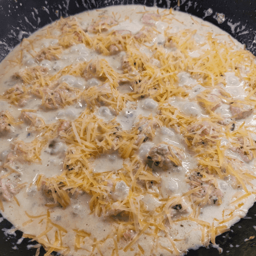 Как только сливки начнут немного подкипать, добавить сыр.