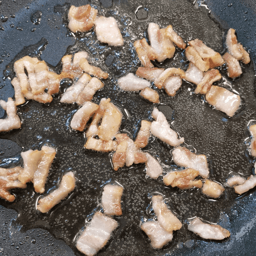 Обжарить сало на сухой раскаленной сковороде до румяности.