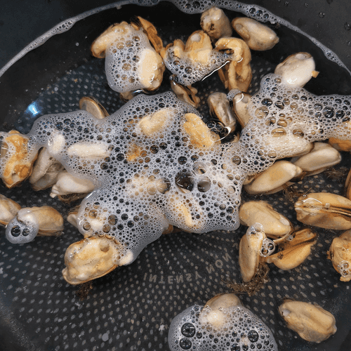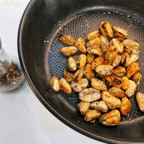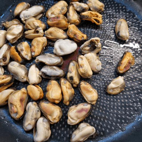 Мидии залить кипятком.