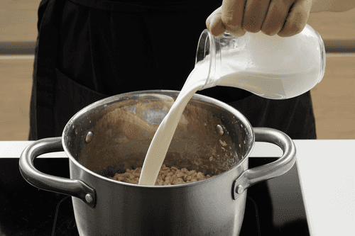 Влить сливки, опять довести перловую кашу до кипения и варить на медленном огне еще 30 минут. Не закрывать кастрюлю плотно крышкой и следить, чтобы каша не убежала. Она должна полностью впитать жидкость. Если она осталась мокрой, нужно подержать крупу на огне еще немного.