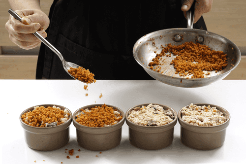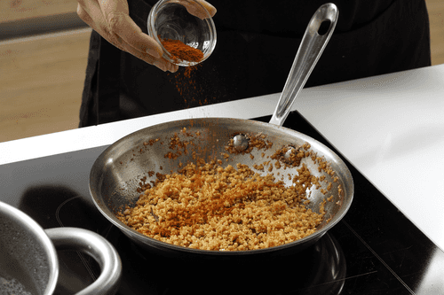 Пока перловая каша варится, на среднем огне на сливочном масле обжарить сухари до легкого золотистого цвета. Снять с огня и смешать с паприкой.