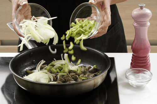 Добавить на сковороду нарезанный полукольцами лук, сельдерей. Посолить, поперчить и жарить все вместе, помешивая, еще минут 15. Лук должен стать золотистым, а сердечки мягкими. Вынуть веточки тимьяна.
