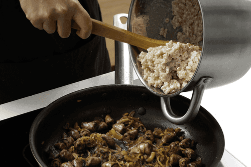 Смешать перловую крупу с сердечками и овощами.