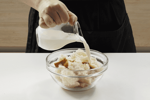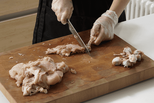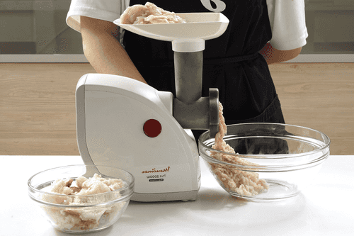 Дважды пропустить через мясорубку мясо, куриную кожу и белый хлеб.