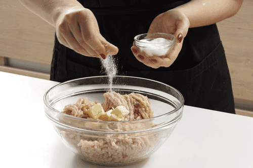 Добавить в фарш пару ложек сливочного масла комнатной температуры, хорошенько перемешать. Добавить соль по вкусу, перемешать.