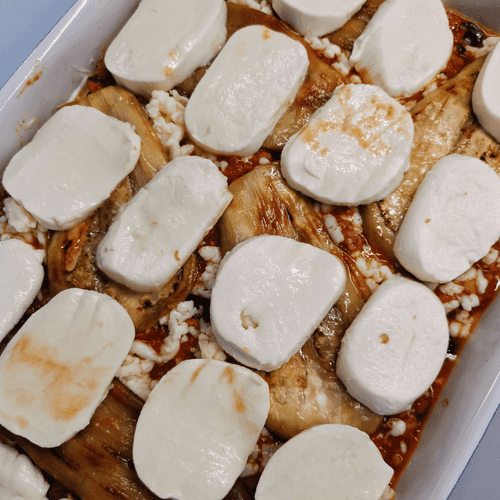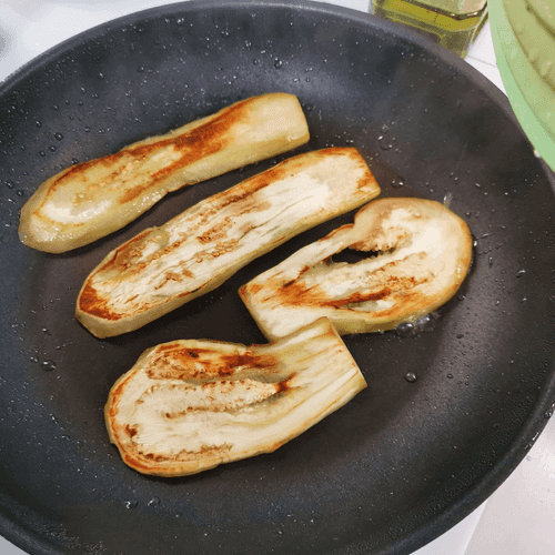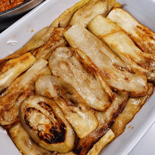 Выложить в форму для запекания слайсы обжаренного баклажана.