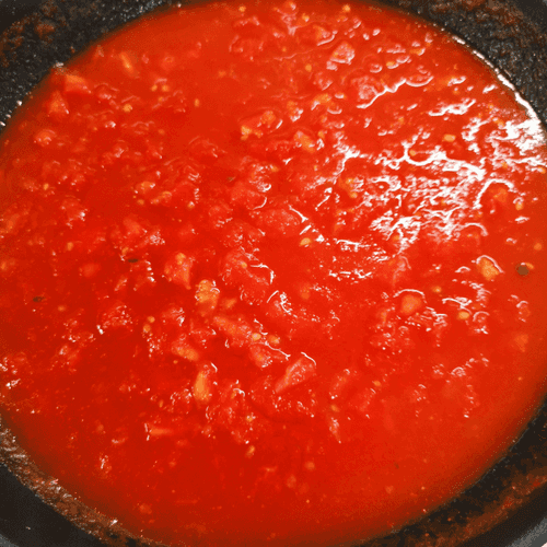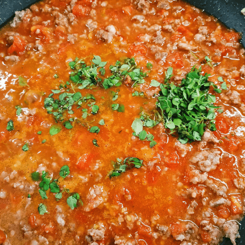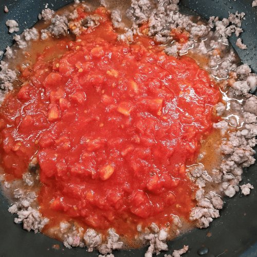 Через 3 минуты перемешать фарш. Еще через пару минут добавить получившийся томатный соус и убавить огонь до среднего.