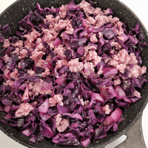 Через 3 минуты перемешать и добавить фарш. Перемешать.