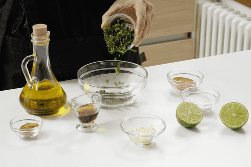 Смешать кинзу, чеснок, оливковое масло, сок 1 лайма, рыбный соус, 0,5 чайной ложки соли, кайенский перец и коричневый сахар.