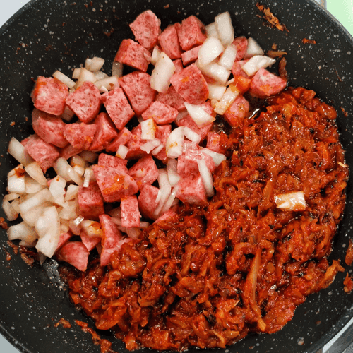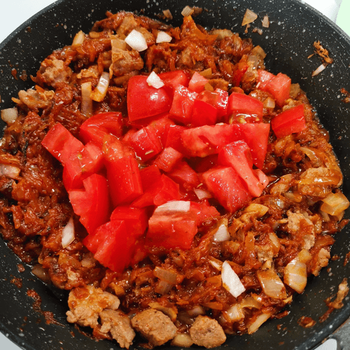 Томатная солянка с мясными колбасками — это авторское блюдо, сочетающее насыщенный вкус томатов, пикантность соуса шрирача и нежность домашней куриной колбасы. Солянка берет свое вдохновение из классических русских рецептов, но приобретает современный характер благодаря оригинальному сочетанию ингредиентов. Белокочанная капуста придает блюду легкость и текстурное разнообразие, а лук и чеснок усиливают аромат. Томатная паста добавляет насыщенности, а свежие помидоры – сочности. Обжарка на оливковом масле позволяет раскрыть вкус каждого компонента. Подается горячей, идеально сочетается с ржаным хлебом или свежей зеленью. Это блюдо отлично подходит как для уютного домашнего обеда, так и для угощения гостей. Оно согревает, насыщает и радует своей яркой палитрой вкусов.