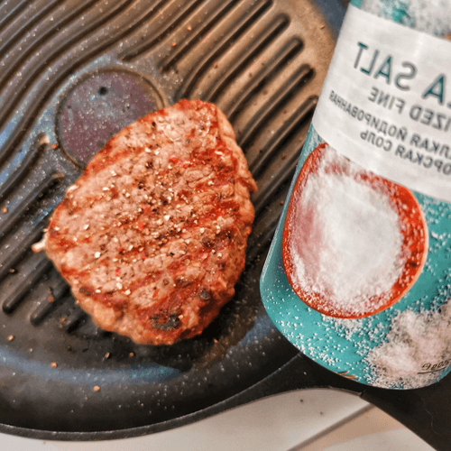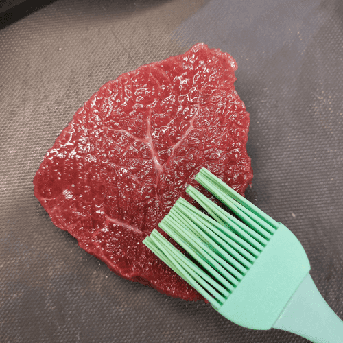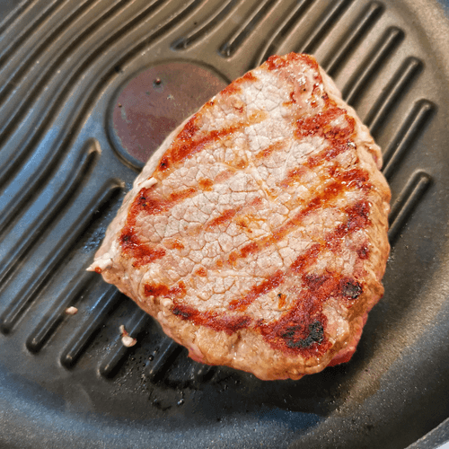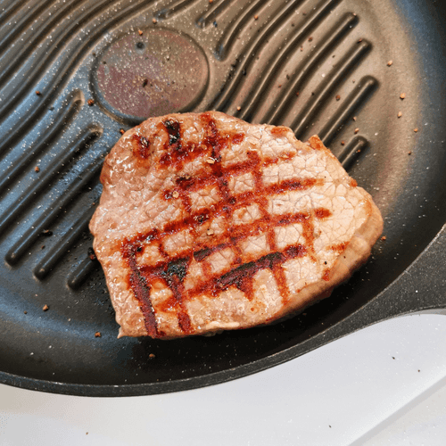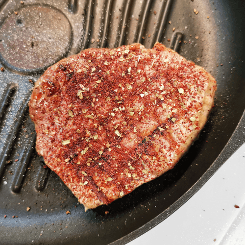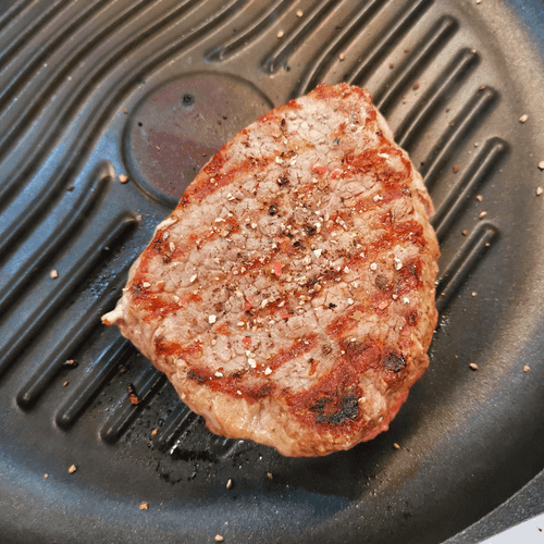 Выложить стейк на сухую раскаленную сковороду-гриль.