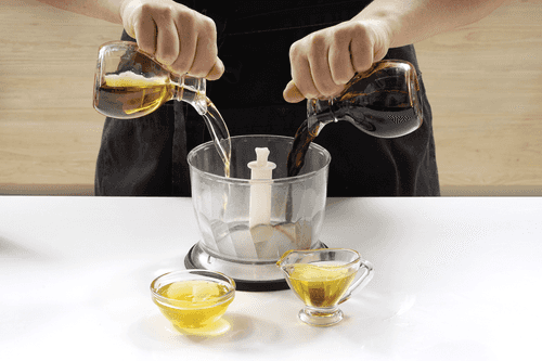 Смешать до однородности соевый соус, рисовый уксус, мед и кунжутное масло в блендере.