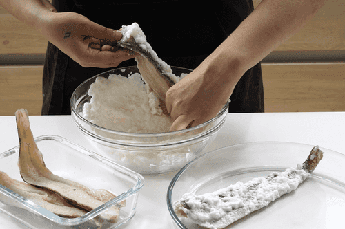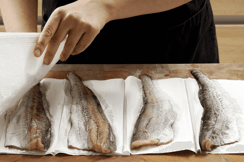 Со стороны кожи опустить во взбитые белки (если филе без кожи, то опустить в белки просто одну его сторону). Дать стечь лишнему.