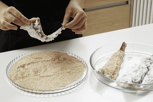Отдельно смешать кунжут и панировочные сухари.