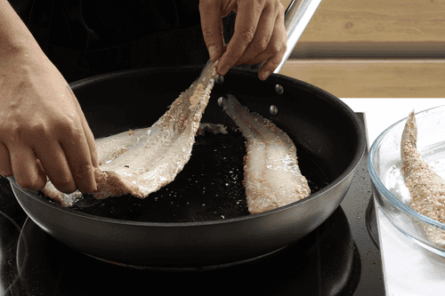 В большой сковороде нагреть рафинированное масло, выложить рыбу панировкой вниз. Готовить 1–2 минуты, пока корочка не станет темно-золотистой.