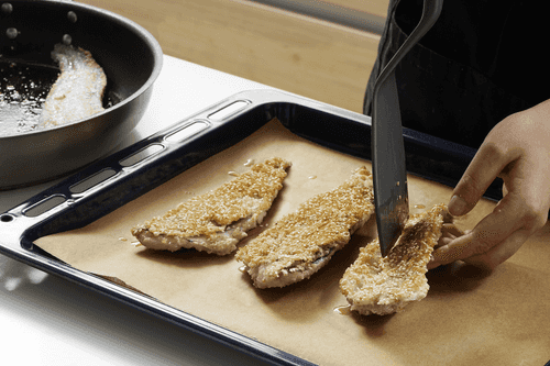 Всыпать кунжут с сухарями в плоскую тарелку и выложить в нее рыбу «яичной» стороной вниз. Переложить рыбу на большую тарелку запанированной стороной вверх.