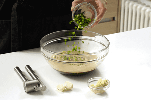 Добавить имбирь, зеленый лук и пропущенный через пресс чеснок. Хорошенько перемешать.