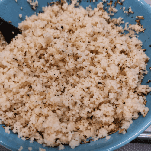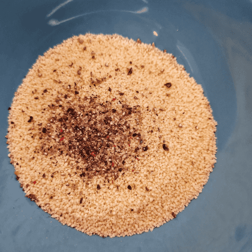 Кускус насыпать в глубокую миску и приправить смесью перцев.