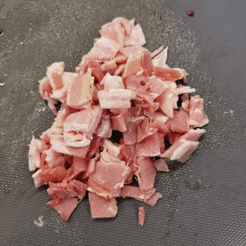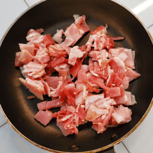 На сухой раскаленной сковороде обжарить бекон до золотистой корочки.
