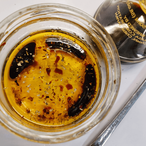 Влить масло в глубокую емкость и приправить травами.