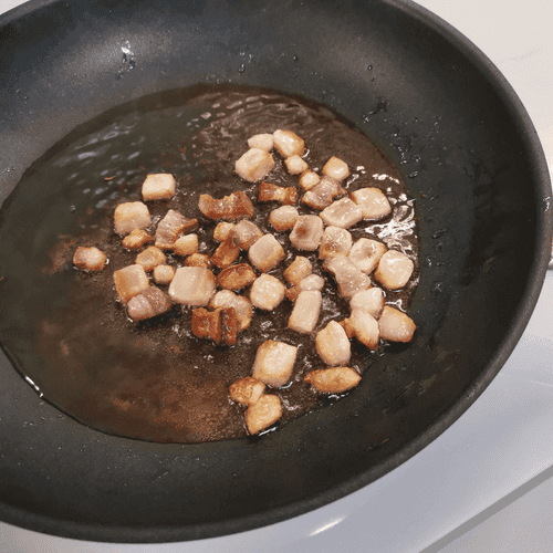 На сухую раскаленную сковороду выложить сало. Обжаривать на сильном огне, периодически помешивая.