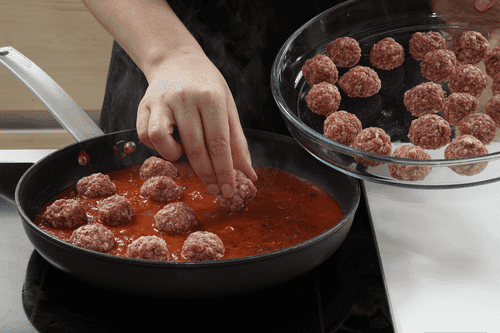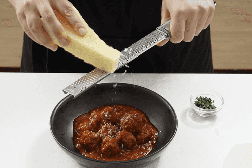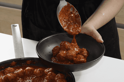 Простое и оригинальное блюдо: ароматный томатный соус проникает в пористую текстуру фрикадельки, придавая ей насыщенный вкус и соки. Эти фрикадельки можно подавать как основное блюдо с любым гарниром — от картофельного пюре до риса, гречки или даже стейка из цветной капусты. Однако мы предпочитаем наслаждаться ими в чистом виде, окуная кусочки подсушенного пшеничного хлеба в соус. Не забудьте щедро посыпать фрикадельки тертым сыром — он расплавится и добавит блюду особую нотку.