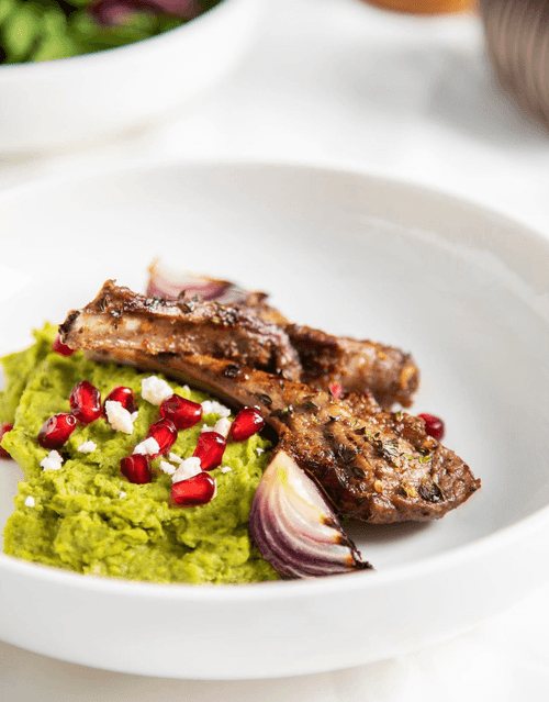 Каре ягненка в цитрусовом маринаде с пюре из зеленого горошка