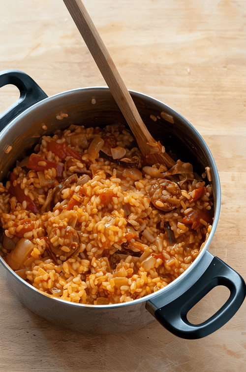 Поставить кастрюлю с томатным пюре на огонь и добавить оставшееся масло. Когда оно нагреется, отправить жариться бекон, курицу, половину кровяной колбасы, половину чоризо и половину турецкого гороха. Вмешать рис и влить горячий бульон. Аккуратно перемешать.