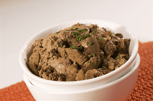 Готовую печенку уложить на блюдо, полить растопленным маслом и соком, полученным при жарении. На каждый ломтик печенки сверху можно положить обжаренный ломтик свиной копченой грудинки.