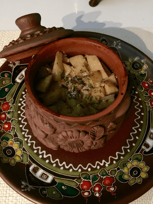 В глиняный горшок положить мясо, картофель, лук, коренья, посолить, поперчить по вкусу, добавить лавровый лист и влить немного бульона.