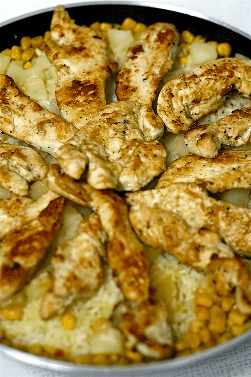 За 3 минуты до готовности риса добавьте в сковороду ананасы вместе с соком. Доведите рис до готовности. Подавайте, положив грудки поверх риса.
