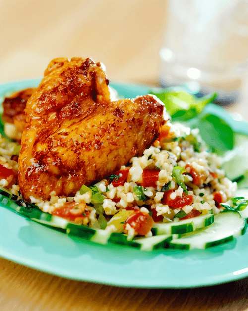 Выкладываем на тарелку готовый булгур, сверху — тушеную курицу.