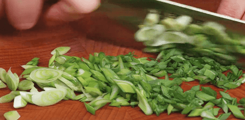 Лук нарезать вдоль стебля на тонкие стрелки и слегка наискось поперек на несколько частей.
