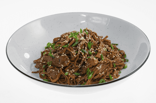 Гречневая лапша с уткой и кунжутом — это изысканное блюдо паназиатской кухни, сочетающее насыщенные ароматы и нежную текстуру. Гречневая лапша, традиционно популярная в Японии и Корее, обладает ореховым вкусом и прекрасно сочетается с сочной утиной грудкой, пропитанной пряными нотками имбиря, чеснока и тимьяна. Нежное мясо, карамелизированное в соусе терияки и соевом соусе, приобретает глубину вкуса, а кунжут придает пикантную текстуру и изысканный оттенок. Легкая кислинка лимонного сока подчеркивает богатство ингредиентов. Это блюдо идеально подходит для ужина, где хочется насладиться гармонией вкусов Востока, обогащенных современными кулинарными традициями.