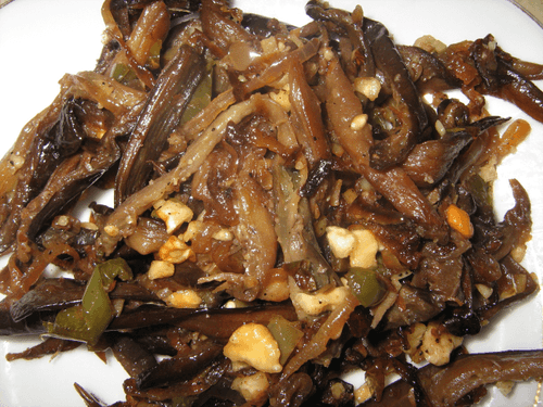 Баклажаны нарезать тонкой соломкой, хорошенько посолить и оставить на ночь (не менее чем на 5 часов). Они уменьшатся в несколько раз.
