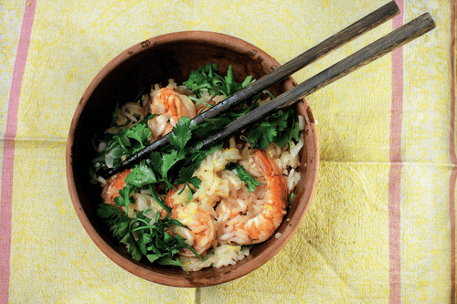 Этот рецепт объединяет китайские и европейские кулинарные традиции. Он требует определённой сноровки и контроля времени: креветки нужно готовить одновременно с рисом. Если у вас нет под рукой специального соуса для суши, не беда – его можно заменить комбинацией рисового уксуса, рисовой водки и немного сахара. В качестве альтернативы можно использовать сладкий херес вместо рисовой водки.